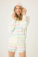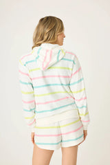 Happiness, but make it a hoodie. With breezy pastel stripes in citrusy hues, this vintage terry zip-up brings a dose of color to laid-back lounging. Front pockets keep it practical, while pop-thread drawcords add a playful touch. Perfect for throwing on after a beach day, cozying up at home, or chasing golden hour.