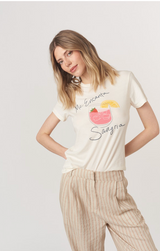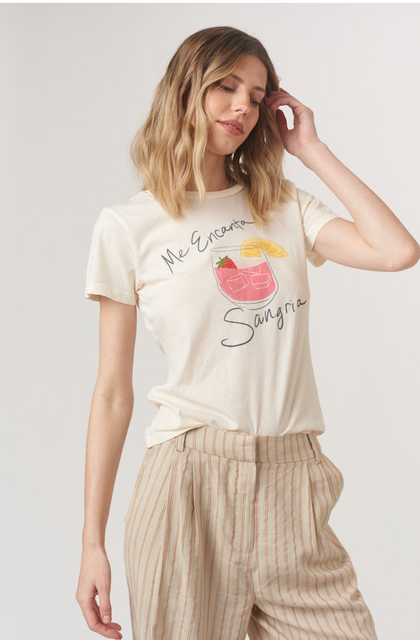 Sangria Tee is made from a soft jersey slub and features a colorful illustrative graphic of a sangria glass. Finished with the phrase me encanta sangria, it’s a lighthearted nod to our favorite summer drink.